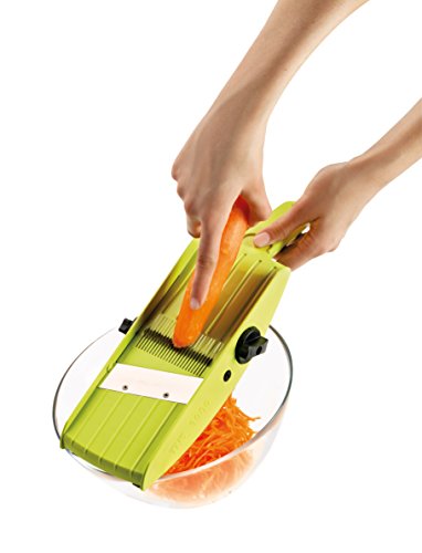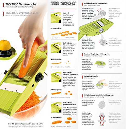 U koopt hier een originele TNS 3000 groenteschaaf All in one in een kleur BLAUW inclusief resthouders. Het origineel van de televisie, bekend van telescopische zenders en van beurzen en markten. Met gedetailleerde gebruiksaanwijzing (mogelijk niet beschikbaar in het Nederlands). Hoogwaardige kwaliteit en afwerking van de Duitse fabrikant TNS – Made in Germany All in One – geen inzetstukken om te wisselen. Je bespaart daardoor kostbare tijd en kostbare ruimte. Het origineel met 36 verschillende mogelijkheden van voedselveilig kunststof, lood- en cadmiumvrij. Hoogwaardige en stabiele schaaf met zeer scherp verwisselbaar lemmet. Alle snijmessen van roestvrij staal. De hoogteverstelling: o met de linkerknop stel je de schijfdikte van 1 tot 9 mm een o stand 1 + 2: voor ca. 1 + 2 mm dunne schijven, bijv. voor komkommers, radijs, wortelen, kruid, uienringen, rubli, aardappelgratin o stand 3 en 4: voor ca. 3 en 4 mm dikke schijven, bijvoorbeeld voor paprika, pauw, koolrabi, rubli, citroen, kruid of stand 5 en 6: voor ca. 5 en 6 mm dikke schijven, bijvoorbeeld voor sinaasappels, courgettes, appels, look, niveau 7 tot P voor 7 tot 9 mm dikke schijven, deze stand maakt het mogelijk om dikkere frietjes dan 6 mm te snijden. De voormesverstelling: o met de rechterknop stel je de voormessen in, zonder voormes zijn er schijven o niveau 1 voor schijven, bijvoorbeeld voor komkommers, radijsjes, radijsjes, radijsjes, wortels, kruid, uienringen o stand 2 met de grove voormessen ca. 7 mm dik, bijvoorbeeld voor friet, gemengde groenten, uien, wortelen, koolrabi, soepengroenten, niveau 3 met de fijne voormessen ca. 3 mm dik, bijvoorbeeld voor strips van komkommers, radijs of stand 4 met de middelste voormessen ca. 5 mm dik, bijv. voor strepen van radijs, rublis, selderij, appels en de Aziatische keuken.